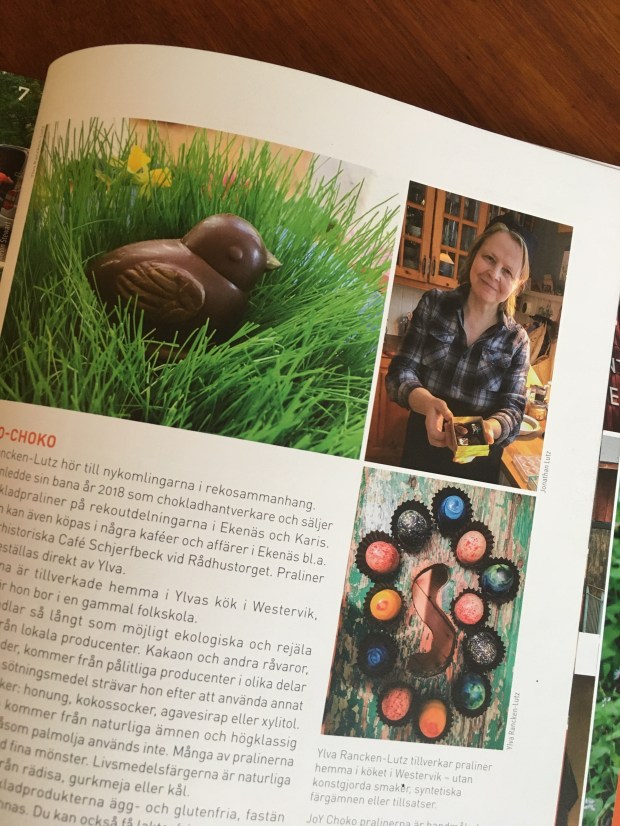 Passionerat närproducerat! Smaka på Västnyland (2019) heter boken om närproducerad mat i Västra Nyland. Bokens redaktör är Bitte Westerlund. JoYChoko är med i boken bland ett 20-tal andra producenter. Det känns kul att får den äran att vara en av närproducenterna fast RekoSkolans huvudsakliga projekt de senaste året varit att hålla workshops och föreläsningar om hållbarhet och då speciellt om kakaoproduktion med hands-on workshops i pralintillverkning. Boken är vinnare av 2019 Nordisk måltidslitteratur.