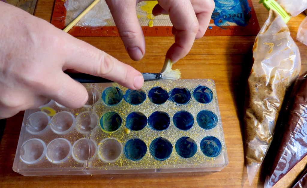 Det är så otroligt fint att vi nu även i Norden kan köpa naturliga chokladfärger för praliner. När jag började laga praliner för 4 år sen efter chokladkurser på Nora chokladskola fanns det inte många färger att köpa som var naturliga, det vill säga pigmentet gjorda på naturliga råvaror – som blått av spirulina, gult av gurkmeja och rött av rödbeta – så jag importerade från USA. Men nu går det att få tag på i Norden t.ex på Marron i Sverige. Nu är ju inte heller from augusti 2022 till exempel titandioxid (E170) tillåtet i EU (det har inte varit det på många år tex i Australien) så då går ju utvecklingen snabbare. Massor med piller och tex tuggummi laseras med titanoxid.