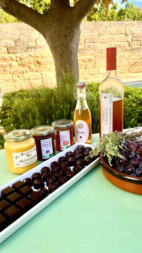 Första workshoppsdagen i Uzes. Vi lagade praliner med ros, timjan och nektarin, plommon och lokalt sött vin. Så roligt få använda lokala råvaror. Uzes torg är ett av de största i Pont de Gard regionen.