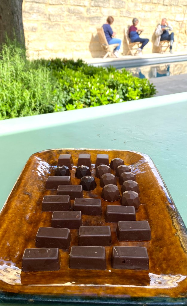 På andra dagens chokladworkshop i Uzes regnade det så det var en perfekt dag att spendera tiden med att experimentera med nya lokala smaker. Vi lagade praliner fyllda med lakritskola, fikon och mandel, mandelnougat, lokalt vin och ros med vanilj.